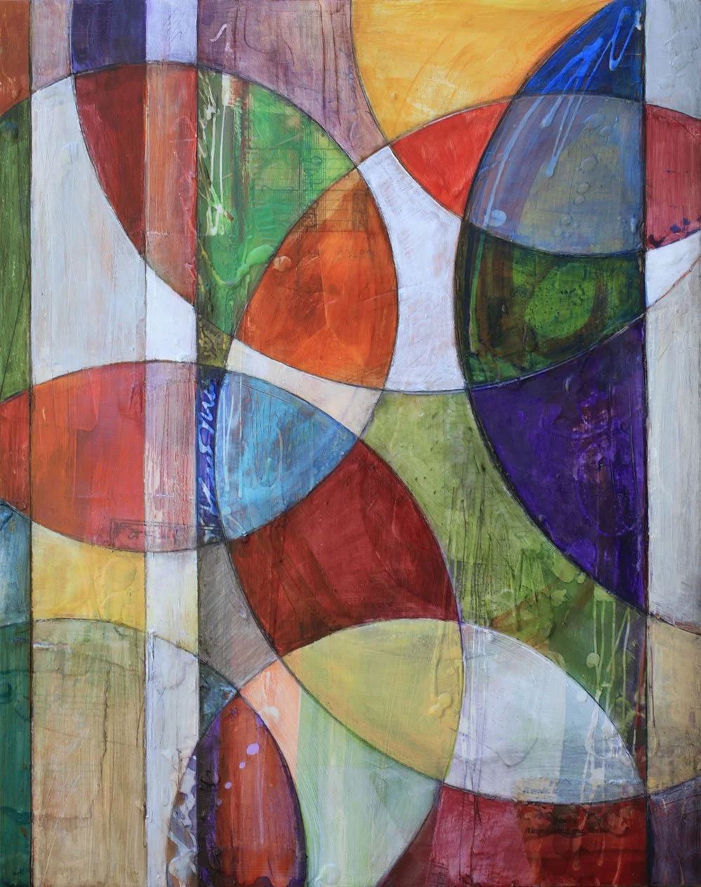"Circling," Acrylic, beeswax and collage on panel, 12 x 12 inches